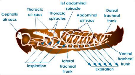 When we think of respiratory systems, we usually think of the lungs or of gills. But insects have a different system called a tracheal system. Here is a picture of what the system looks like, using a grasshopper as an example: