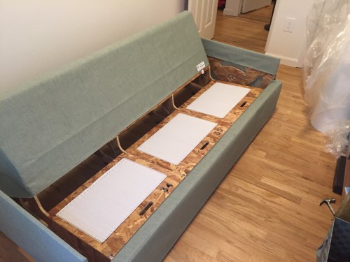 The upholstery (I chose a seafoam color) fit nicely against the wood frame.