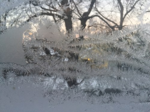 Looking out my mom’s living room window this morning, through the frosted glass.