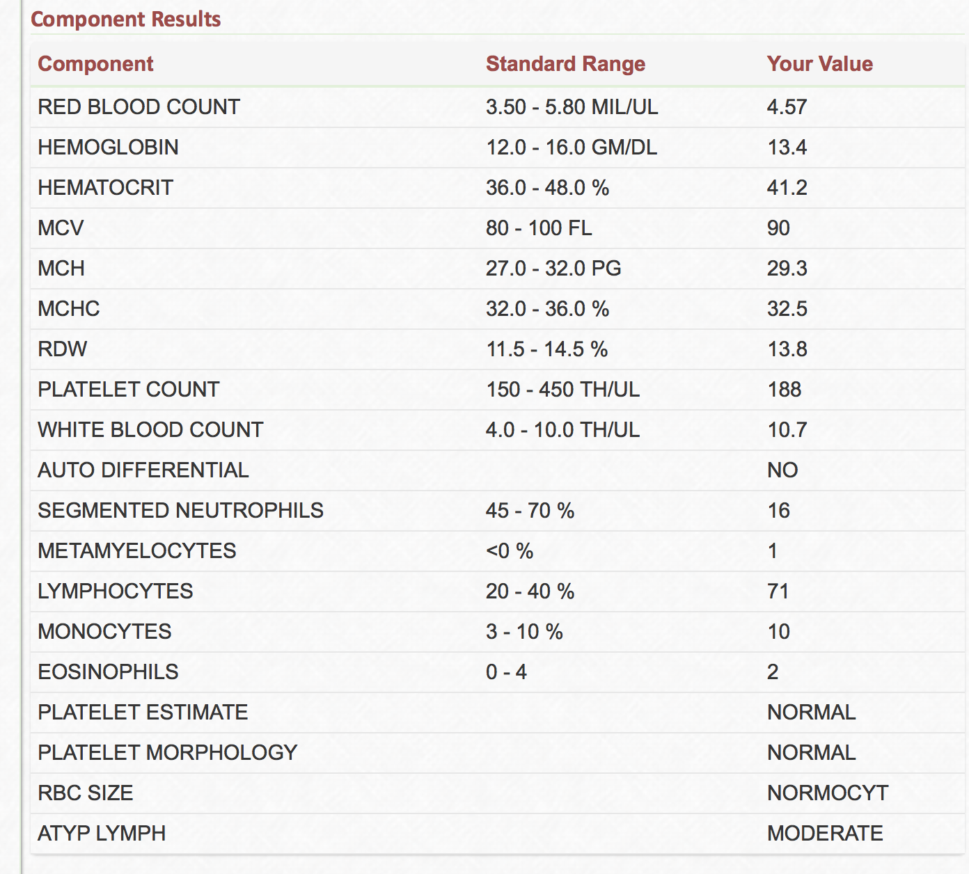OK, I’m no doctor (yet). So when I see values outside the normal range, or narrative values that make no sense to me, I have the tendency to become curious (at the least). For example, what the heck does “ATYP LYMPH / MODERATE” (at the very bottom of the screenshot) mean? Enter my good friend Google: this signifies that my immune system is actively fighting an infection. One Web site I found even specifically referenced infectious mononucleosis, explaining that mono produces a lymphocyte morphology with a dented cytoplasm, in addition to some other specific characteristics. So. I’ve got dented lymphocytes. Who knew?