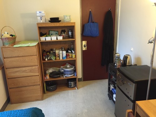 Dresser, more shelves (with my food/utensils), and the little refrigerator