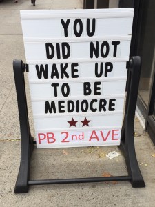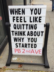 I was out walking on 2nd Avenue the other day, running a quick errand, when I saw a sandwich board sign in front of a fitness studio called Pure Barre that stopped me in my tracks. In New York City, with so much weirdness and activity all around, which you just come to accept as normal, it takes a lot to stop me on the sidewalk. But it was like this sign was talking directly to me. So I paused, and allowed myself to fall into the category of “annoying person stopping on the sidewalk taking a picture with their phone.” This wasn’t a stupid selfie though. This was important self-talk aimed at self-soothing and self-preservation.